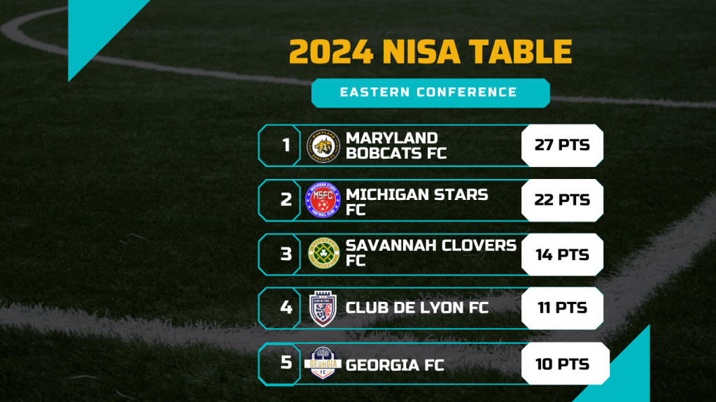 The 2024 NISA season is already halfway over, as we now enter the second half of the season with the NISA playoffs just a few months away. We haven’t had too many surprises through the halfway point, as the Maryland Bobcats FC and the Michigan Stars FC are atop the Eastern Conference. Maryland is also on an eight-match winning streak. Out in the Western Conference, it’s a tight race at the top spot as Irvine Zeta FC is in first with 21 points, while the LA Force is right behind them in second with 19 points. The real question is, can anybody catch them to make up ground in the playoff race? We still have two and a half months left in the regular season, and things can still change in that time. Let me share my thoughts on the first half of the season. First, let’s take a look at the current NISA table.