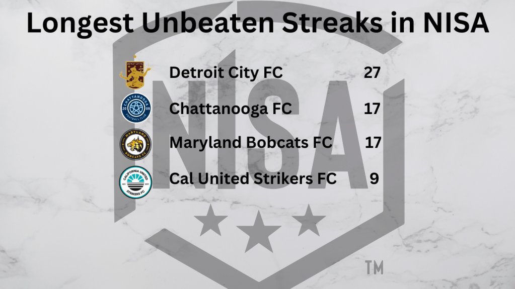 It’s been two months since the Maryland Bobcats FC’s season ended. The club hasn’t announced its plans for the 2025 season or any roster movements. I know there has been much speculation on social media that people are expecting the Bobcats to leave NISA and go to a regional league and eventually move to USL League One, but neither NISA nor the club has announced its plans for 2025. In a recent interview on BT90 in October, Kartik and Calum asked NISA Commissioner John Prutch what happened to exclude the Maryland Bobcats from the NISA playoffs in part 1 of their interview series. Commissioner Prutch stated that the Bobcats have not paid their league dues for two years, did not put in a performance bond, and tried to work with the club during the season to comply, but they refused and also stated that this violates U.S. Soccer rules. Bobcats Club President and CEO Jide Saba and General Manager Mohamed Gueye did an interview on Ron Rowe FC to share their thoughts on the 2024 season. They also expressed their thoughts on the league’s decision to exclude the Bobcats from the 2024 NISA playoffs despite being the top team in the East and wanting answers from the league. As I mentioned, those interviews were from two months ago, and I haven’t heard much since then. It’s hard for me to see a path forward between the Bobcats and the league at the moment regarding 2025, and the Bobcats have removed all mentions of NISA from their bio page and respective social media pages. If this ends up being the final season in NISA for the Bobcats, they will join a list of former NISA clubs who left the league with impressive unbeaten streaks.